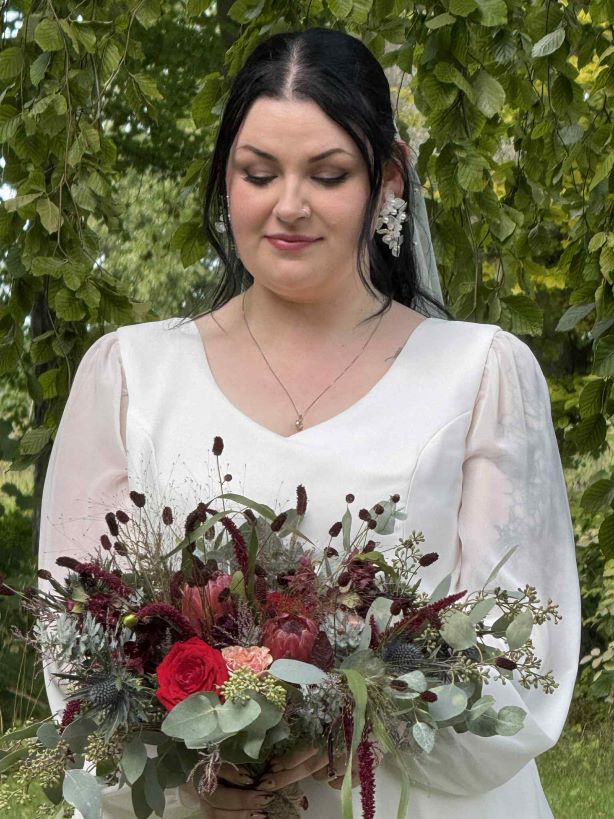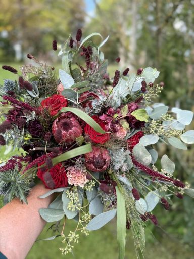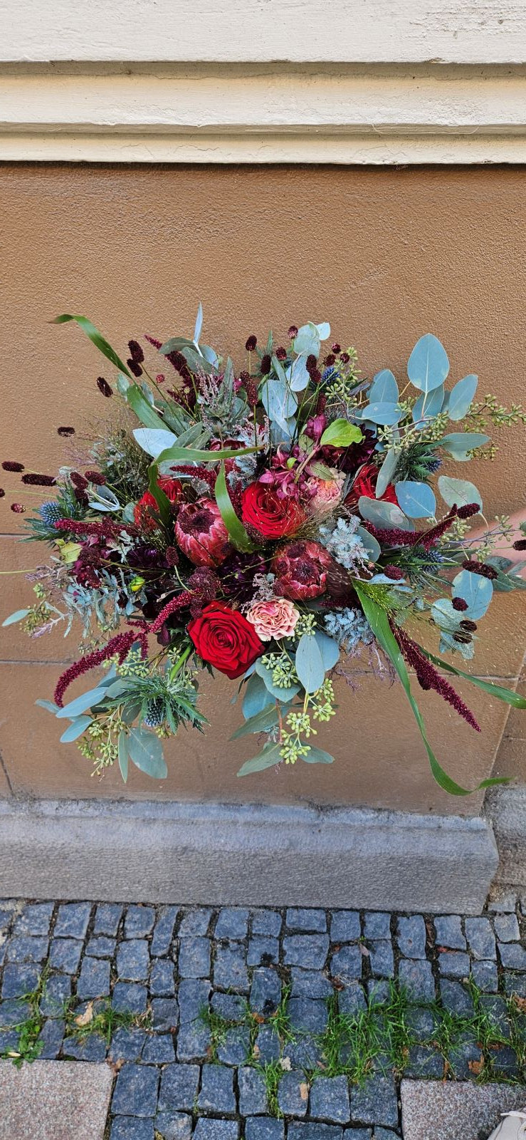 Bukett med vinröda toner med protea, amaranthus, dahlia, ros och massa fint ljuvligt grönt i silvertoner