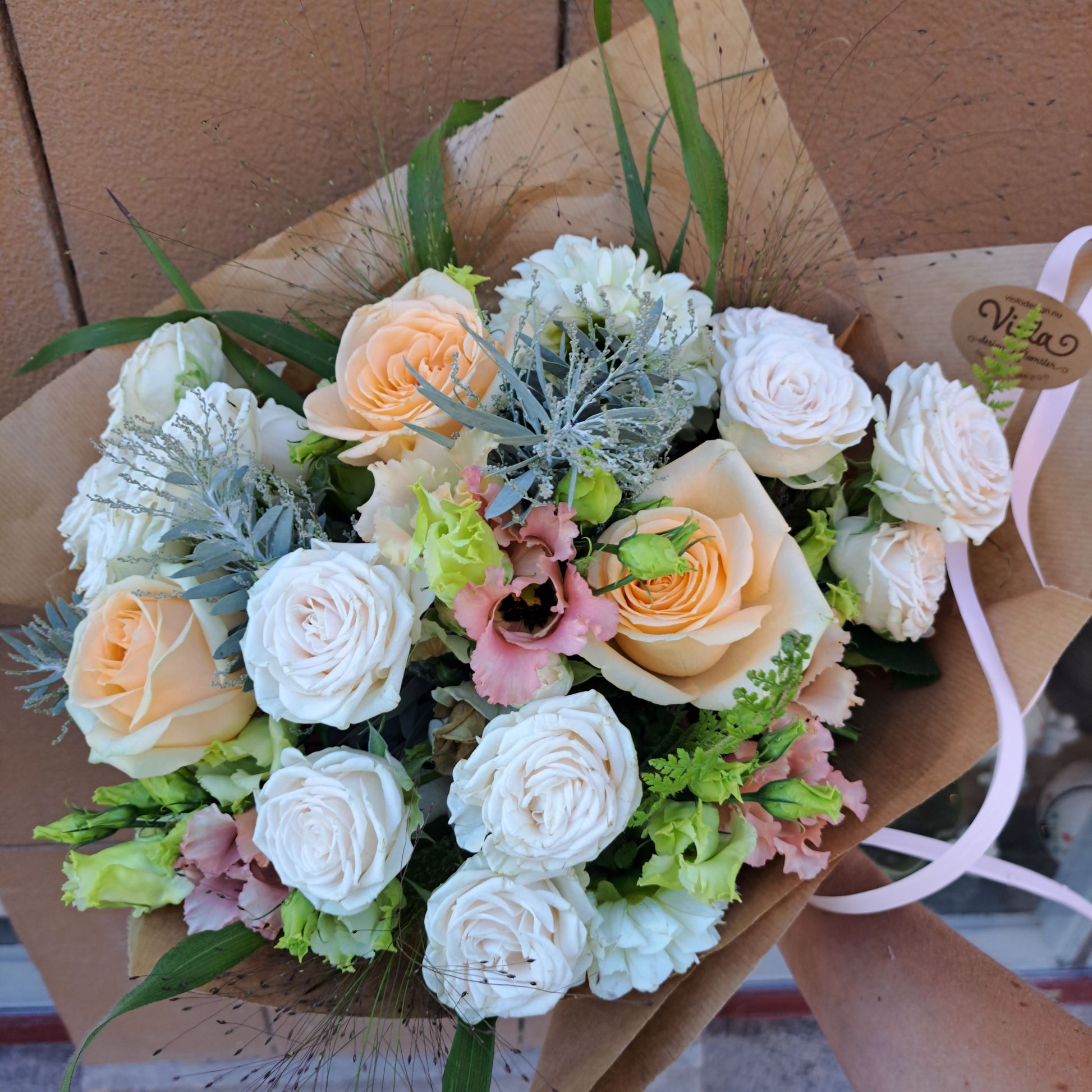 Bukett med rosor, och prärieklocka, kvistrosor i skira ljusa toner
