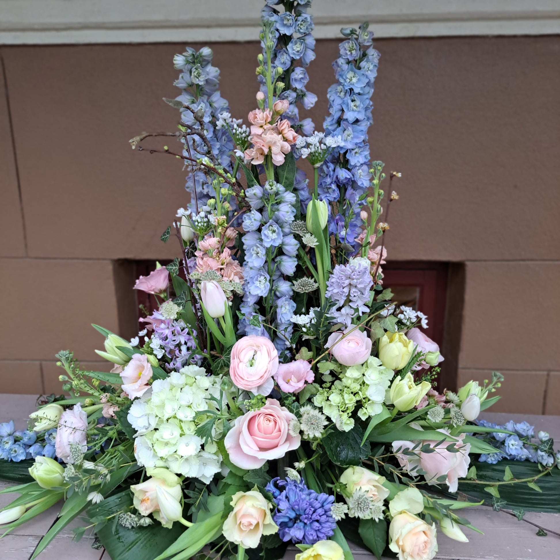 Begravningsdekoration med riddarsporre, lövkoja, tulpaner, hortensia, hyasinter, ros ranunkel i pastellfärger m.m