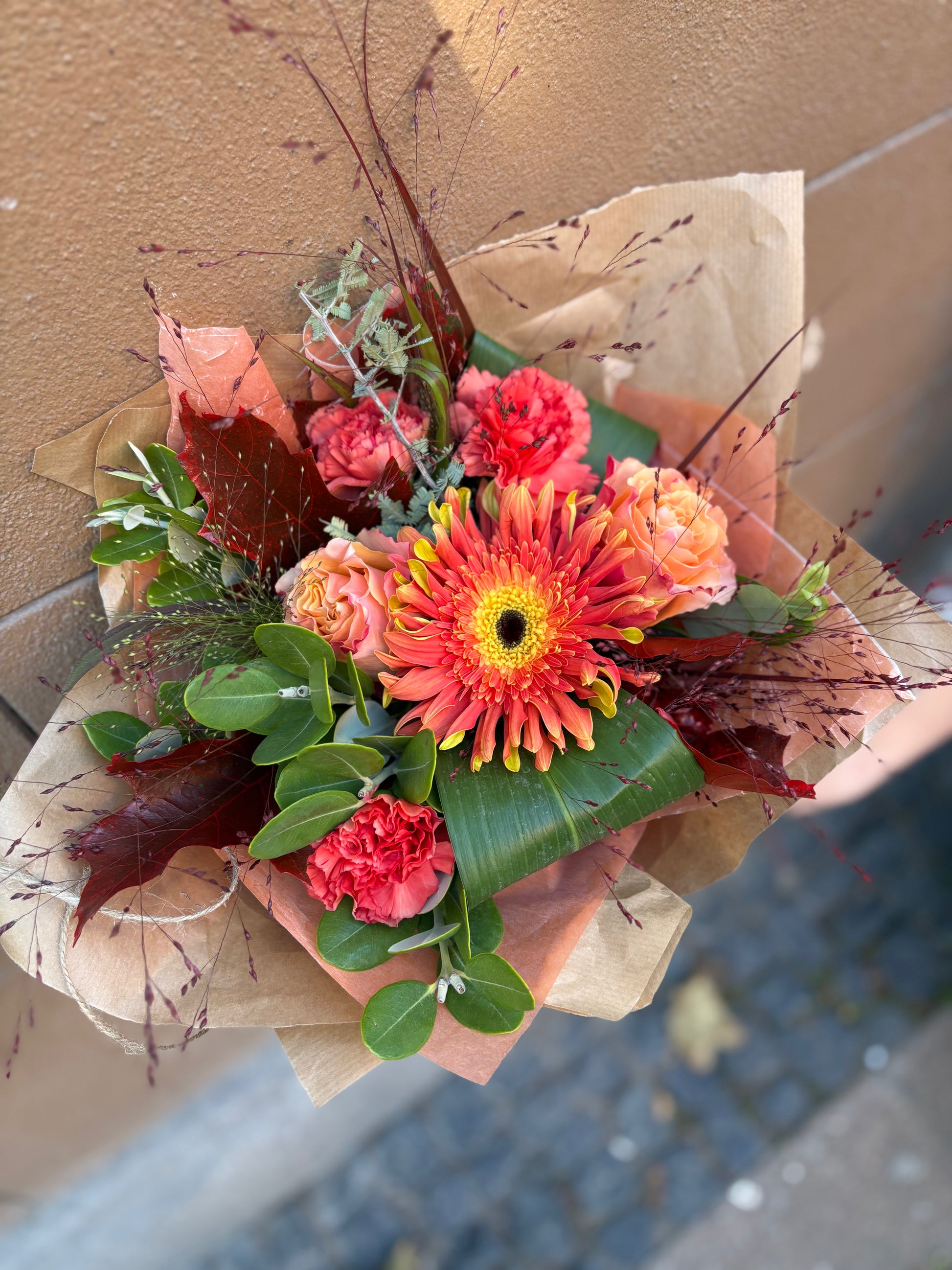 Bukett i orange toner här med gerbera, nejlikor, ros m.m