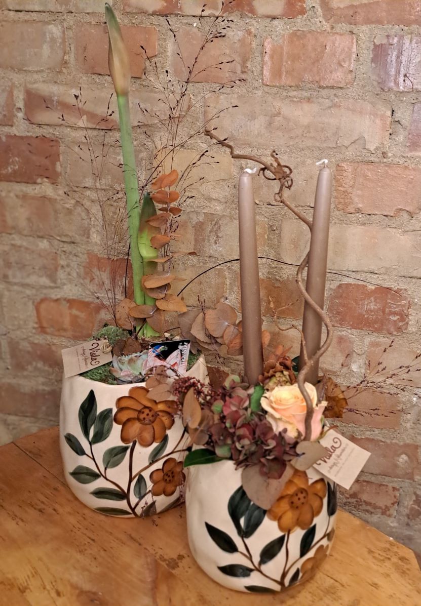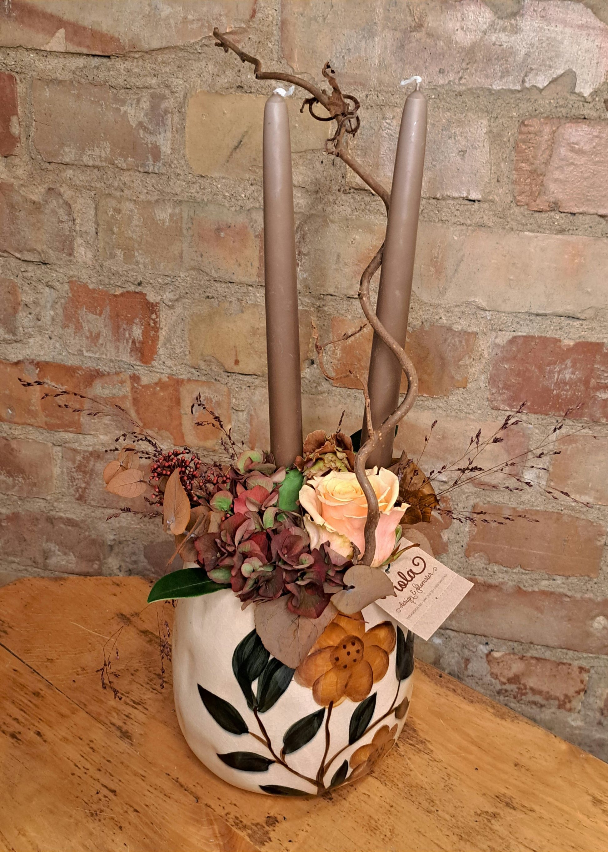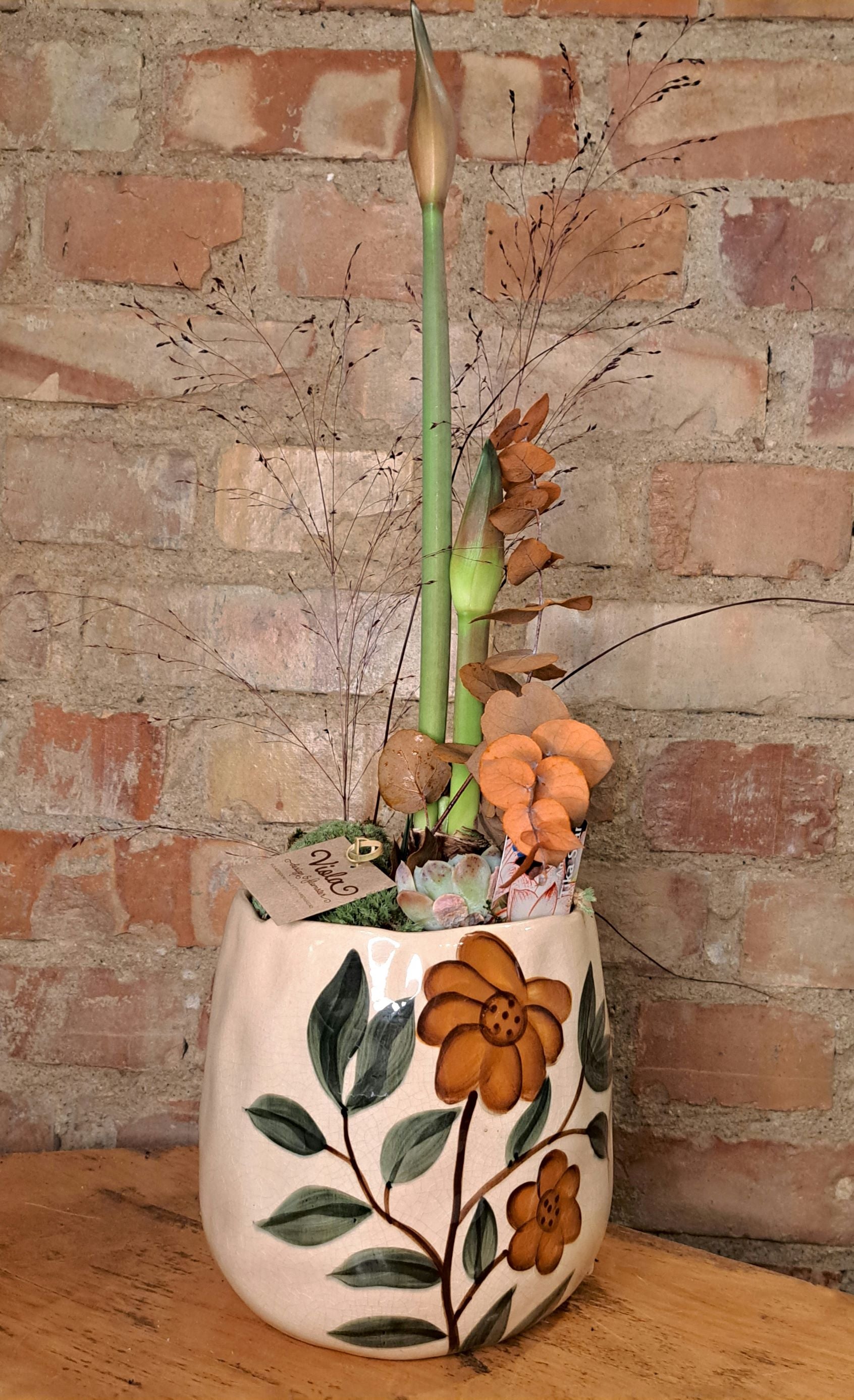 Här är en planetring med amaryllis och fina hösttoner och 1 st ljusdekoration