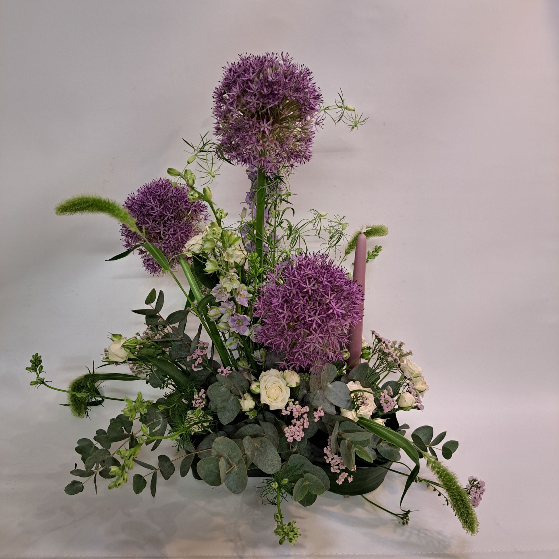 Arrangemang med med allium , riddarsporre, vit kvistros och ljus i!