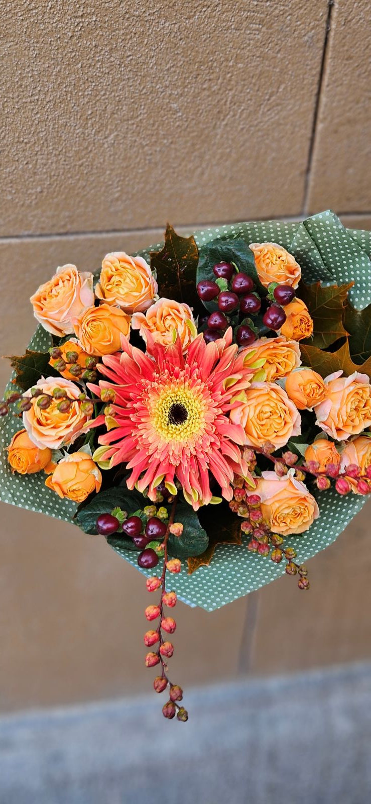 Bukett med härliga starka orange toner ed fina bär hypericum, germimi, kvistros m.m