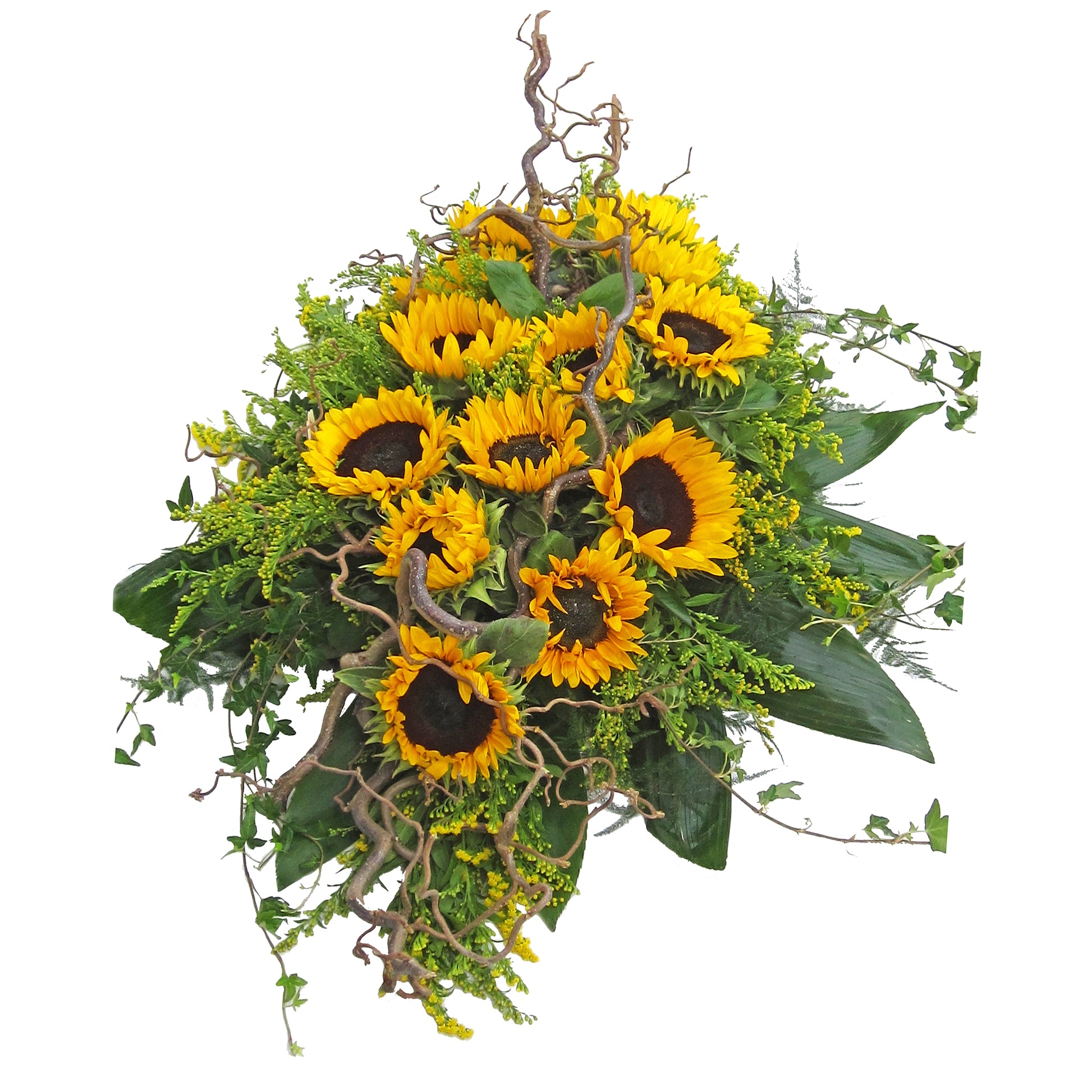 Kistdekoration med solrosor , grenar , solidago och gröna blad