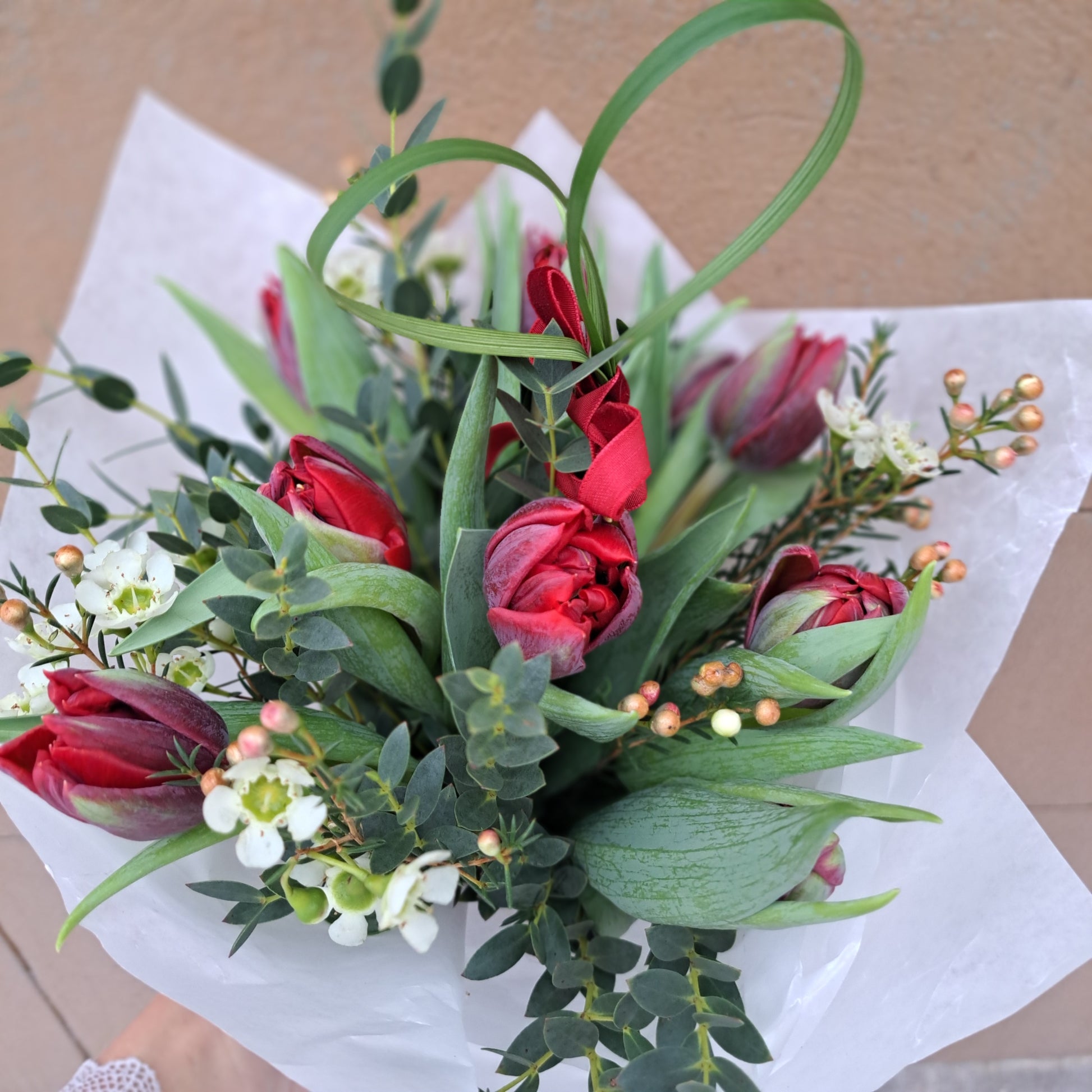 Bukett med röda tulpaner , vaxblomma , pavifolia, med ett hjärta i gräs!med vaxat papper i!