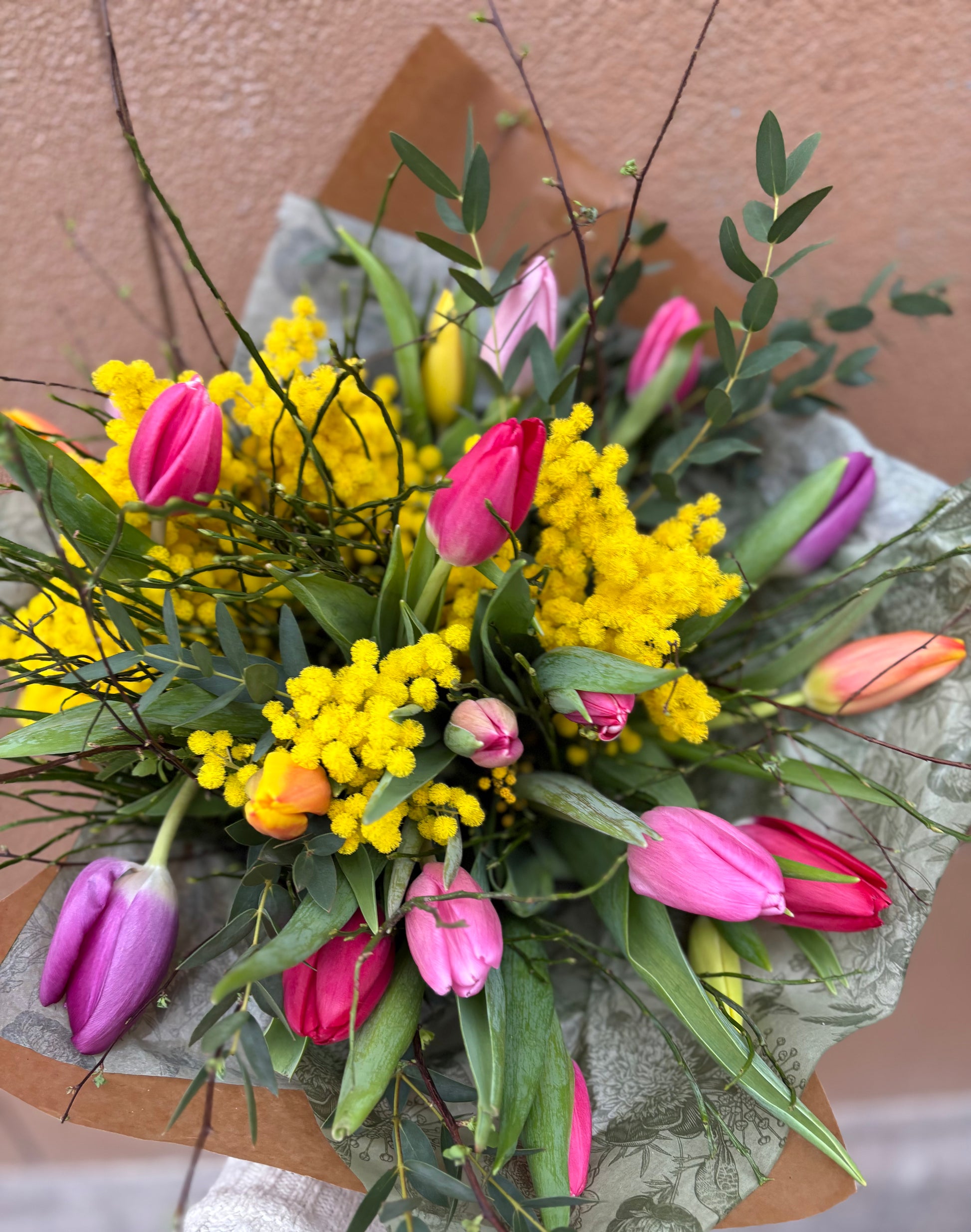 Bukett med tulpaner i blandade färger , mimosa, skirt grönt och vackert papper runt om